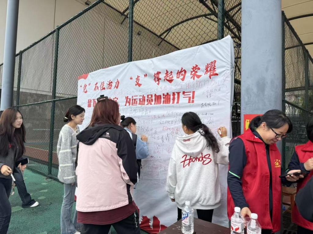 服务站聚焦师生核心需求,打造全方位保障体系。“动态能量补给站”备齐矿泉水、功能饮料及红糖水,及时为参赛师生补充运动消耗;“移动关怀小分队”由支部党员牵头,在服务站旁设置临时指导区,针对长跑、跳跃等项目,指导师生开展赛前关节激活与赛后肌肉拉伸,帮助多名运动员有效缓解腿部酸痛。此外,“加油留言墙”上贴满师生们的赛事祝福与运动感悟,值班党员化身“摄影师”,捕捉选手冲线、队友拥抱等温情瞬间,第一时间将照片赠予师生,传递赛场正能量。