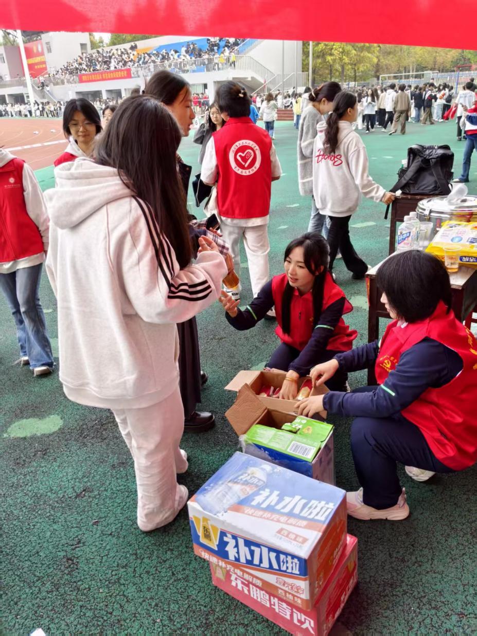为确保服务高效落地,党支部提前细化分工、周密筹备:专人负责横幅标语与留言墙制作,专人筹备保温桶、宣传展板,专人统筹临时帐篷、桌椅及各类饮品采购,专人设计定做志愿者马甲。校运会期间,党支部党员严格按排班表轮值坚守。11月8日秋雨淅沥,赛场地面湿滑,党员们依旧履职尽责——上午冒雨加固帐篷,用抹布反复擦干桌椅积水;下午提前备好一次性雨披,运动员冒雨冲刺后,立刻递上热红糖水与雨具,部分党员还撑着伞坚持为赛后选手开展拉伸服务。雨水虽打湿了党员马甲,但服务站的红色身影始终未退,确保服务“不打烊”。