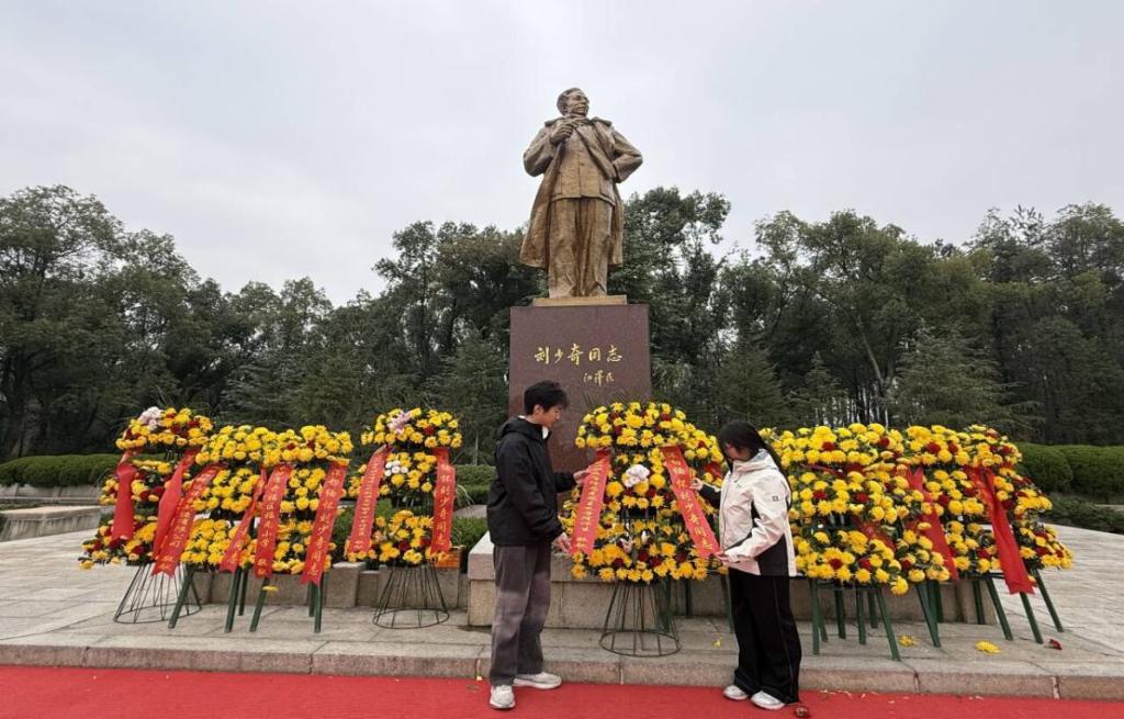 随后,师生们移步刘少奇铜像广场,在司仪与礼兵的引导下,向刘少奇同志铜像敬献花篮。两名学生代表缓步上前整理花篮缎带,全体人员肃立行三鞠躬礼,深切缅怀刘少奇同志为党和人民事业建立的不朽功勋,整齐的队列与庄重的神情,彰显着新时代师生对革命先辈的深切敬意。