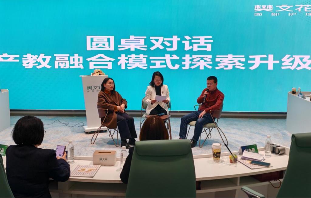 经验分享环节亮点纷呈。樊文花书院院长、学校兼职教师赵海燕详细介绍“以店带训” 创新人才培养模式,该模式依托企业真实门店场景,实现教学与实践深度融合,让学生在真实面部护理环境中锤炼技能、提升综合素质,达成学习过程与工作过程的有机统一,为美妆领域人才培养提供了可复制推广的有效路径。我校化妆品经营与管理专业妆管 2304 班学生钟烂辉作为樊文花订单班及优秀实习生代表,分享了在校企联合培养下的成长历程,她表示,通过企业真实项目实训与岗位轮岗锻炼,不仅扎实掌握了专业技能,更明晰了职业发展方向,顺利实现从学生到行业预备人才的过渡。