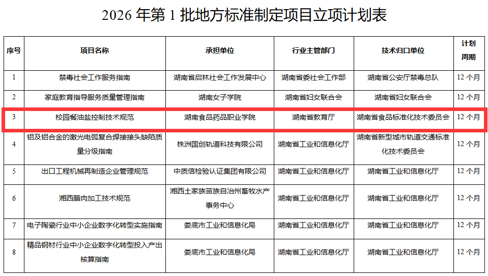 2月4日,湖南省市场监督管理局正式公布2026年度第1批地方标准制定项目计划,由湖南食品药品职业学院牵头申报的《校园餐油盐控制技术规范》地方标准制定项目成功立项。此次立项标志着学校在校园健康餐饮标准化建设领域迈出关键一步,充分彰显了学校服务“健康湖南”建设的责任与担当。