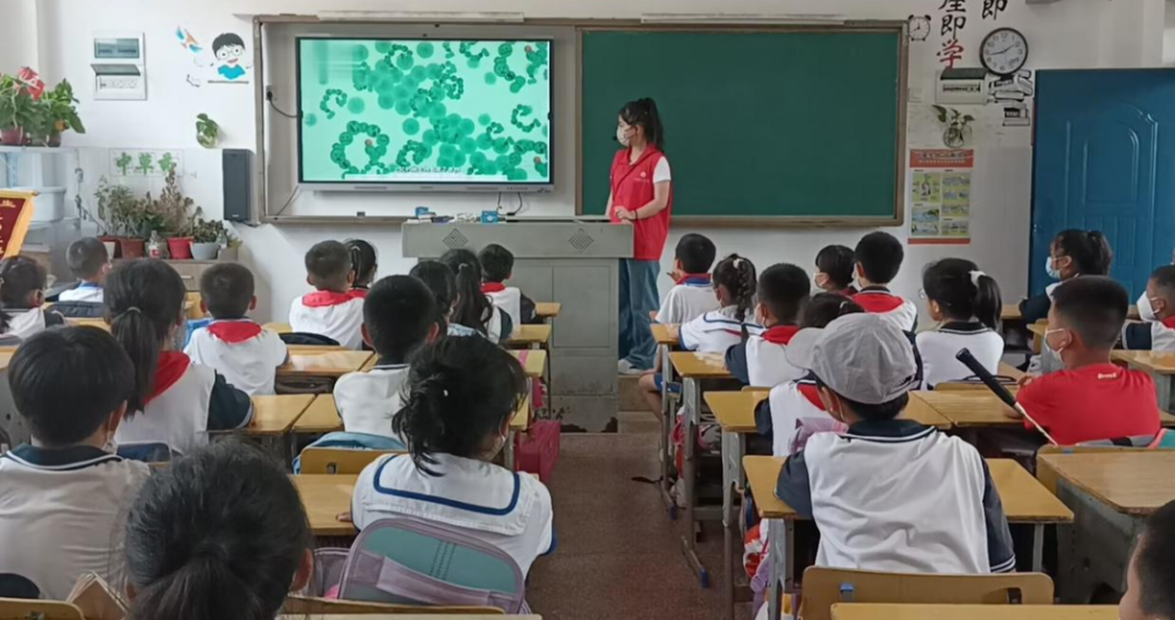 2023年5月,学校青年志愿者协会志愿者前往博才白鹤小学开展“博学善教食安先行”主题食品安全宣讲活动。图为科普食品安全知识。