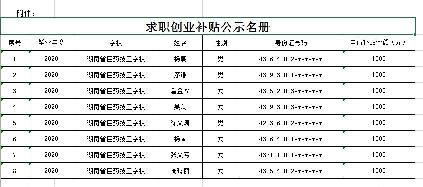 根据《湖南省人力资源和社会保障厅 湖南省教育厅 湖南省财政厅关于进一步做好应届毕业生求职创业补贴发放工作的通知》(湘人社发〔2015〕60号)和《长沙市人力资源和社会保障局关于做好2020届中等职业学校技工院校毕业生求职创业补贴发放工作的通知》文件要求。我校开展了2020届毕业生“求职创业补贴”的申报工作,经个人申请,学院审核,现将申报人员情况进行公示(见附件)。