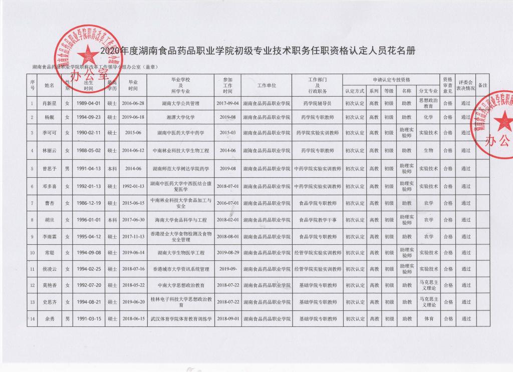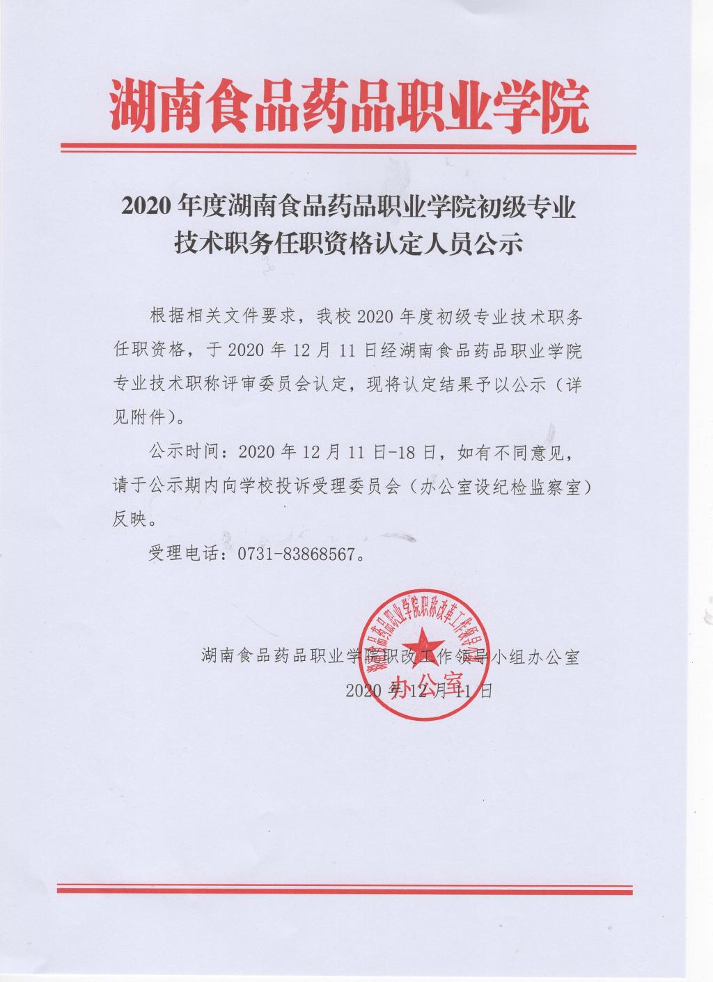 2020年度初级专业技术职务任职资格认定人员公示
