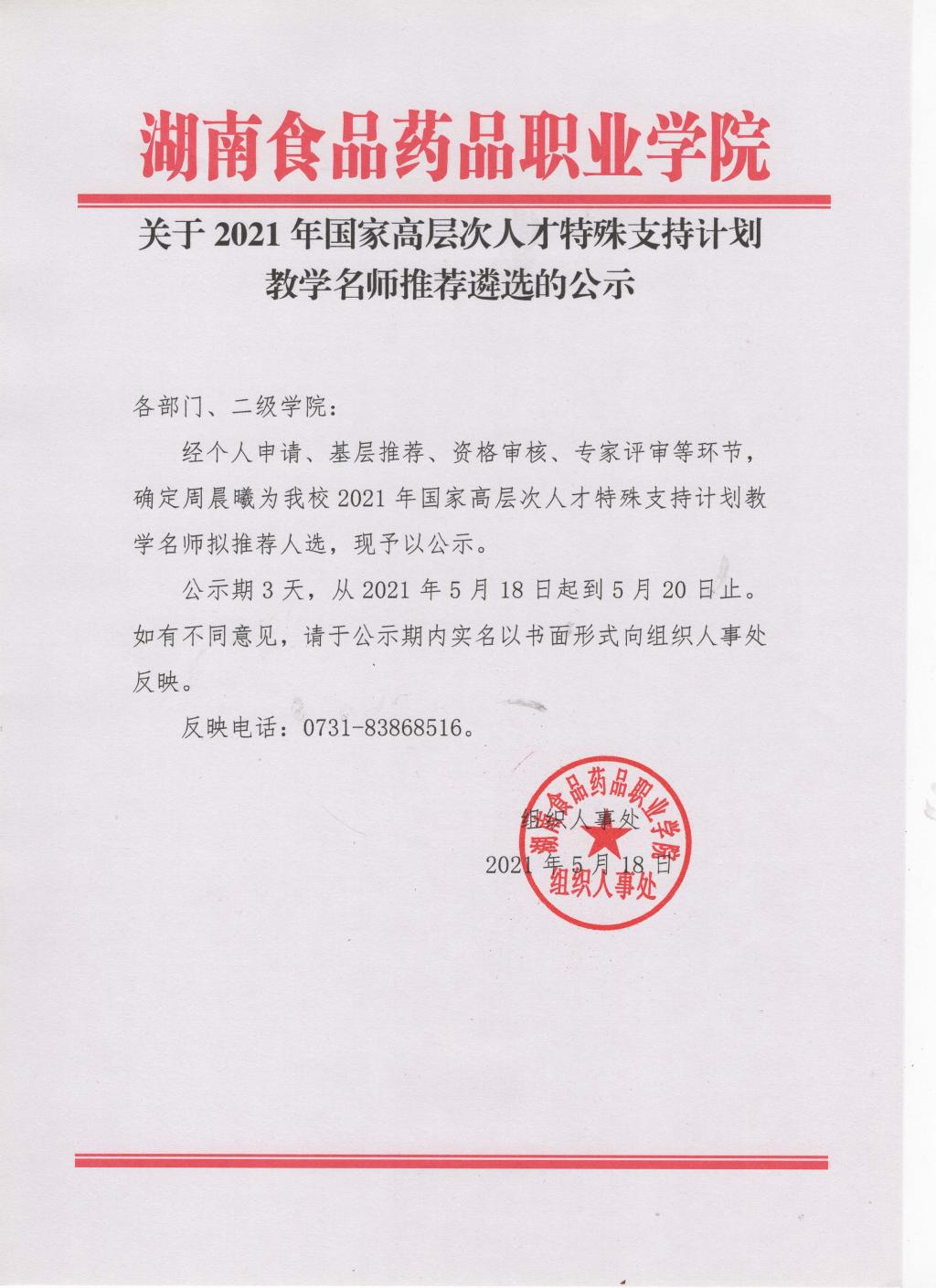 关于2021年国家高层次人才特殊支持计划教学名师推荐遴选的公示