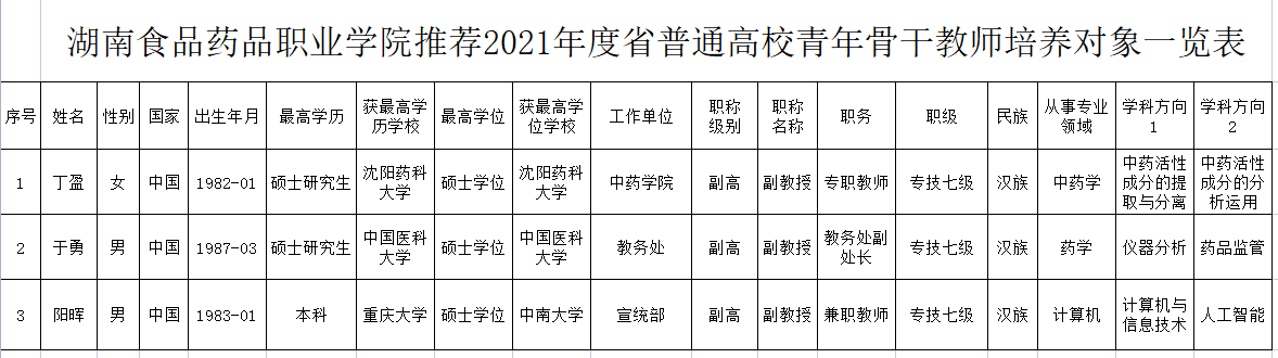 根据省教育厅《关于做好2021年度湖南省普通高校青年骨干教师培养工作的通知》(湘教通〔2021〕318号)文件精神,以及《湖南省普通高校青年骨干教师培养对象管理办法》的相关要求,经个人申请、二级学院初审、学校审核选拔。确定拟推荐对象为丁盈、于勇、阳晖三位老师。