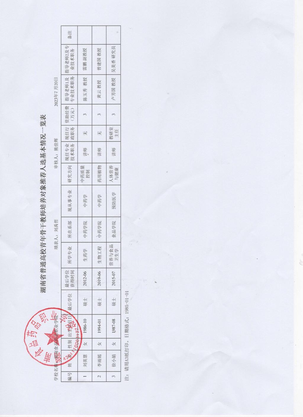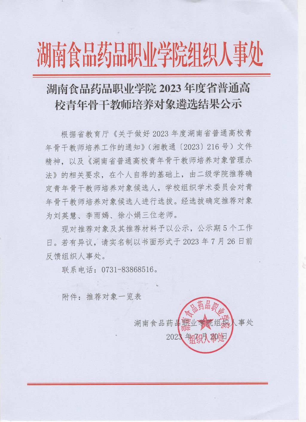 湖南食品药品职业学院2023年度省普通高校青年骨干教师培养对象遴选结果公示