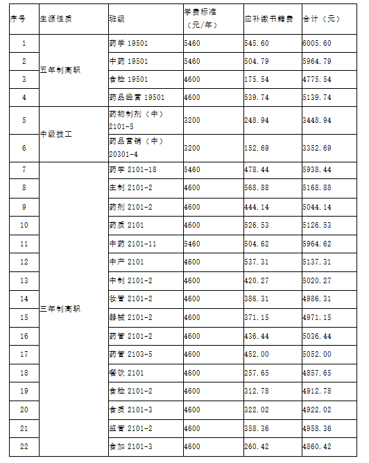 注:实习生应补缴书籍款,系大一、二年级用书费用经核算后应补缴数。