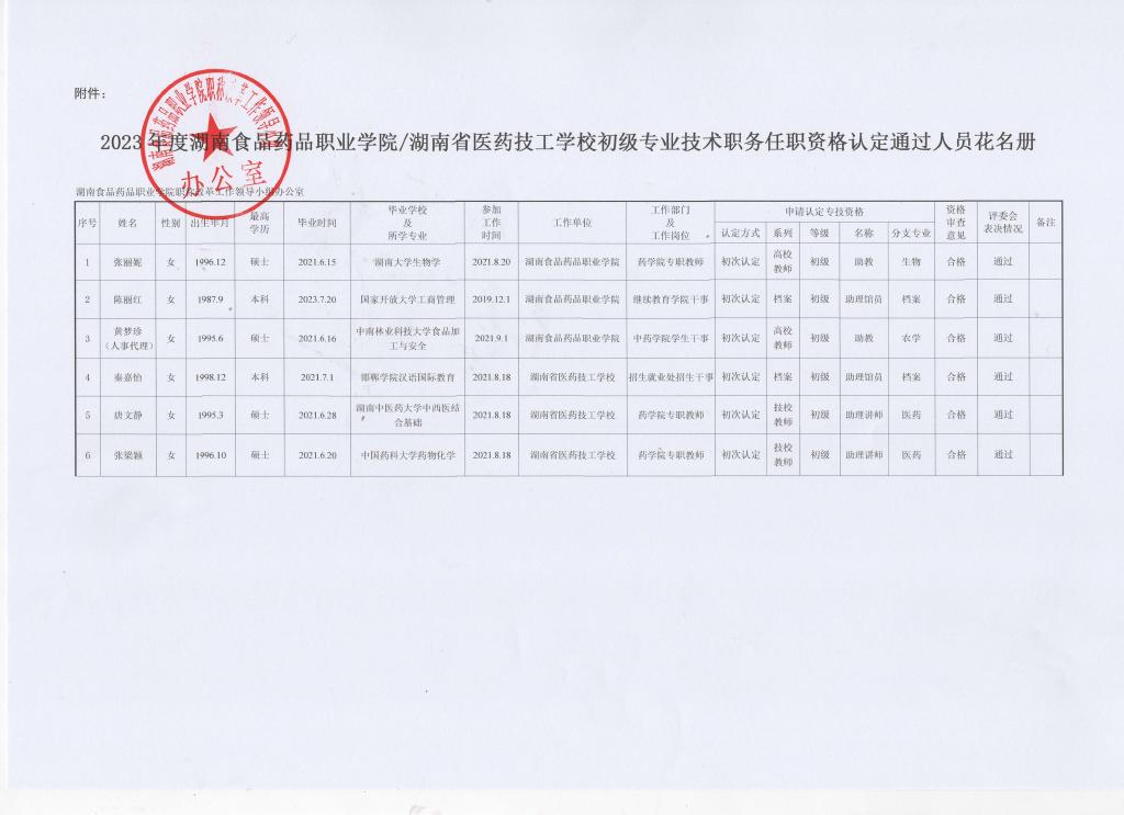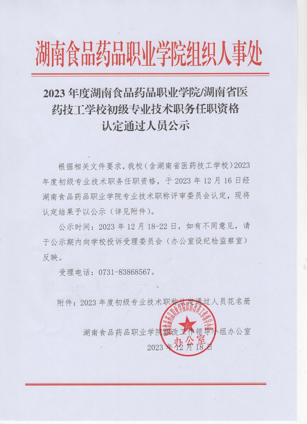 2023年度湖南食品药品职业学院/湖南省医药技工学校初级专业技术职务任职资格认定通过人员公示