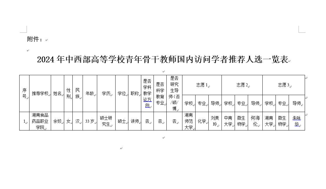 根据湖南省教育厅《关于2024年中西部高等学校国内访问学者推荐选派工作的通知》要求,经个人自荐、二级学院初审推荐、接受学校导师同意接受,报学校审定,拟推荐余姣同志为我校2024年中西部高等学校国内访问学者人选。