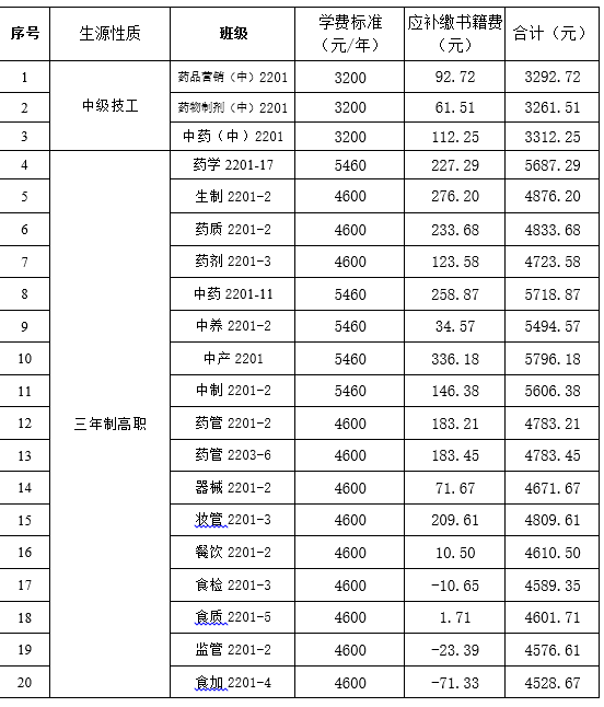 注:1.实习生应补缴书籍款,系大一、二年级用书费用。