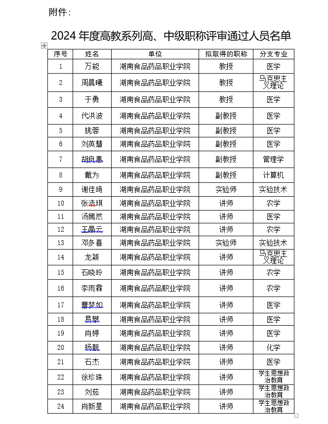 万能等3位同志、代洪波等5位同志、谢佳琦等16位同志,共24位同志(名单附后)已于2024年12月7日-8日,经2024年度湖南食品药品职业学院高校教师系列高(中)级专业技术职称评审委员会评审通过,现予公示,公示时间为5个工作日(2024年12月9日-12月13日)。公示期间如对公示对象的职称评审有意见,可通过电话或书面形式向学校职称投诉举报受理委员会办公室反映。反映情况要实事求是,内容具体详细,以便调查核实。