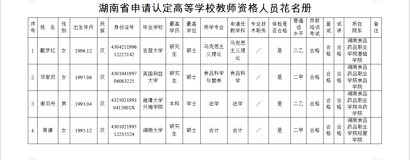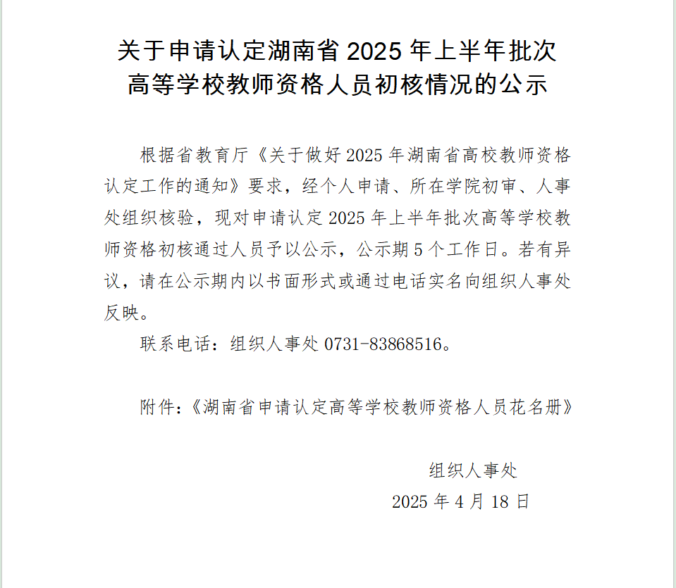 关于申请认定湖南省2025年上半年批次 高等学校教师资格人员初核情况的公示
