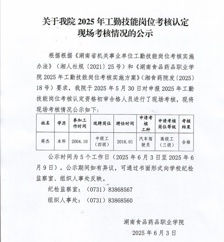 关于我院2025年工勤技能岗位考核认定现场考核情况的公示