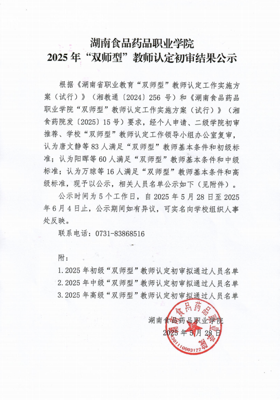湖南食品药品职业学院 2025年“双师型”教师认定初审结果公示