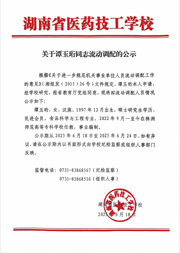 关于谭玉珩同志流动调配的公示