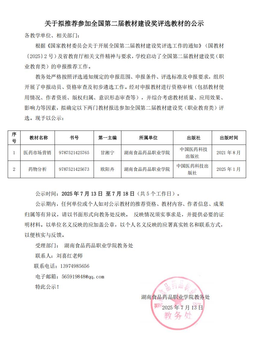 关于拟推荐参加全国第二届教材建设奖评选教材的公示