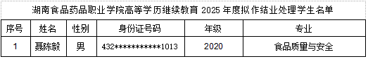 根据《普通高等学校学生管理规定》(教育部41 号令)以及《湖南食品药品职业学院继续教育学籍管理规定》(湘食药院发[2023]5 号)的相关规定和要求,经审查,我校成人高等学历继续教育专科学生聂陈毅,在学校制度规定学习年限内(专科5年)未达到规定的毕业要求,仍有两门课程不合格。经继续教育学院上报学校研究决定,拟对聂陈毅同学予作结业处理,特予公示。