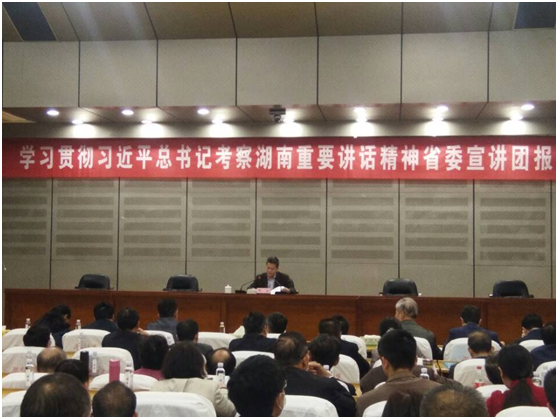 10月20日下午,学校领导班子全体成员在湖南大学参加省教工委组织的《学习贯彻习近平总书记考察湖南重要讲话精神》湖南省委宣讲团报告会,听取了省委宣讲团成员、湖南大学党委书记邓卫所作的专题报告。