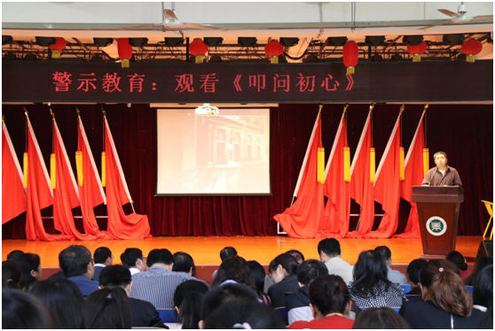 10月13日,我校于多功能报告厅组织中层及以上干部与全体党员学习文章《烫手的红包》及警示教育片《叩问初心》,勉励全体党员不忘初心,自觉做到廉洁用权和廉洁从政。