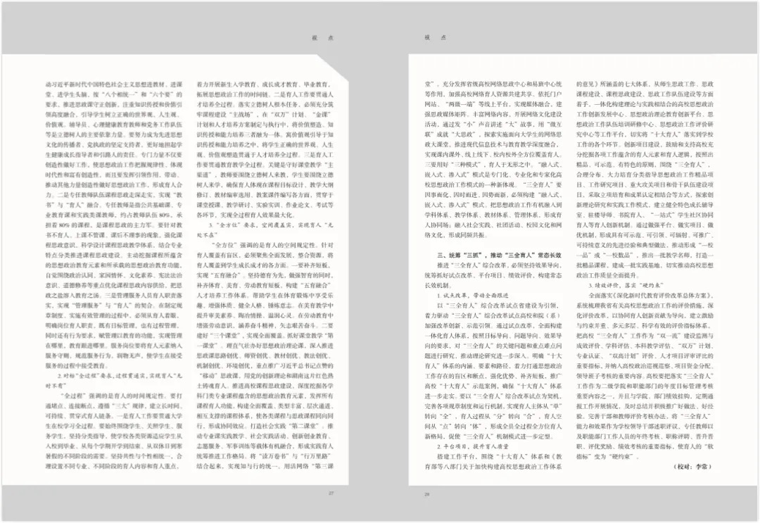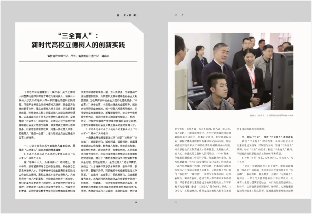 《习近平谈治国理政》(第三卷)关于立德树人的重要论述深刻回答了高校为谁培养人、培养什么样的人以及如何培养人等一系列理论问题和实践问题。习近平总书记在湖南考察时又强调,要全面贯彻党的教育方针,落实立德树人根本任务,深化教育教学改革,把社会主义核心价值观融入各级各类学校课程。认真落实习近平总书记立德树人重要论述,全面推动“三全育人”综合改革,必须以习近平新时代中国特色社会主义思想为指导,紧紧围绕立德树人根本任务,以新思政观引领改革,构建一体化育人体系,打通育人“最后一公里”,着力形成全员全过程全方位育人新格局。