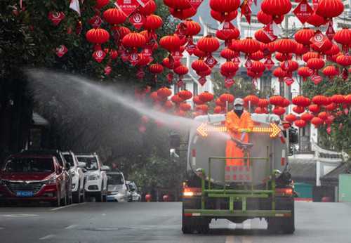 (2020年2月3日,洪江市环卫工作人员利用洒水车对黔城镇人民路街道进行消毒。 胡浩 摄)