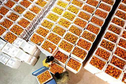 (2020年12月27日,双峰县梓门桥镇黄马洲现代农业产业园脐橙加工车间,员工在分类整理红心脐橙。向红卫 李建新 摄)