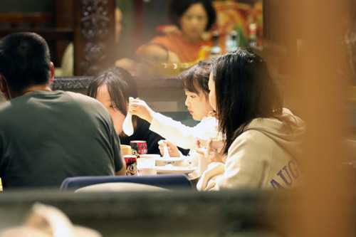 ( 2020年4月20日,衡阳市珠晖区某商场湘菜店,顾客正在使用公勺就餐。随着疫情防控形势的持续转好,该市餐饮行业坚持抓好防疫措施不松懈,以优质的服务和美食吸引顾客,各企业的堂食消费日益回暖。 罗茂盟 摄)