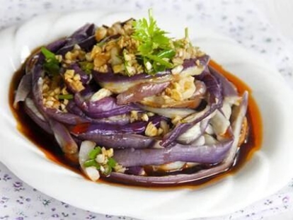 做法:茄子洗净削皮,切成小片,放入碗内,撒上少许盐再投入凉水中,泡去茄褐色,捞出放蒸锅内蒸熟,取出晾凉,蒜捣末,将炒锅置于火上烧热,加入香油,下花椒炸出香味后,连油一同倒入小碗内,加入酱油、白糖、米醋、精盐、味精、蒜末,调成汁,浇在茄片上;香菜择洗干净、切段,撒在茄片上,即成。