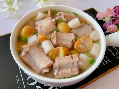 做法:鲜山药洗净去皮切片,板栗去壳,芡实、香菇洗净浸泡20分钟,排骨洗净下锅加冷水焯水备用,香菇泡软后切片,将备好的食材全部放入锅中加水煮沸后改小火煲30-40分钟,最后根据个人口味喜好加食用盐调味即可。