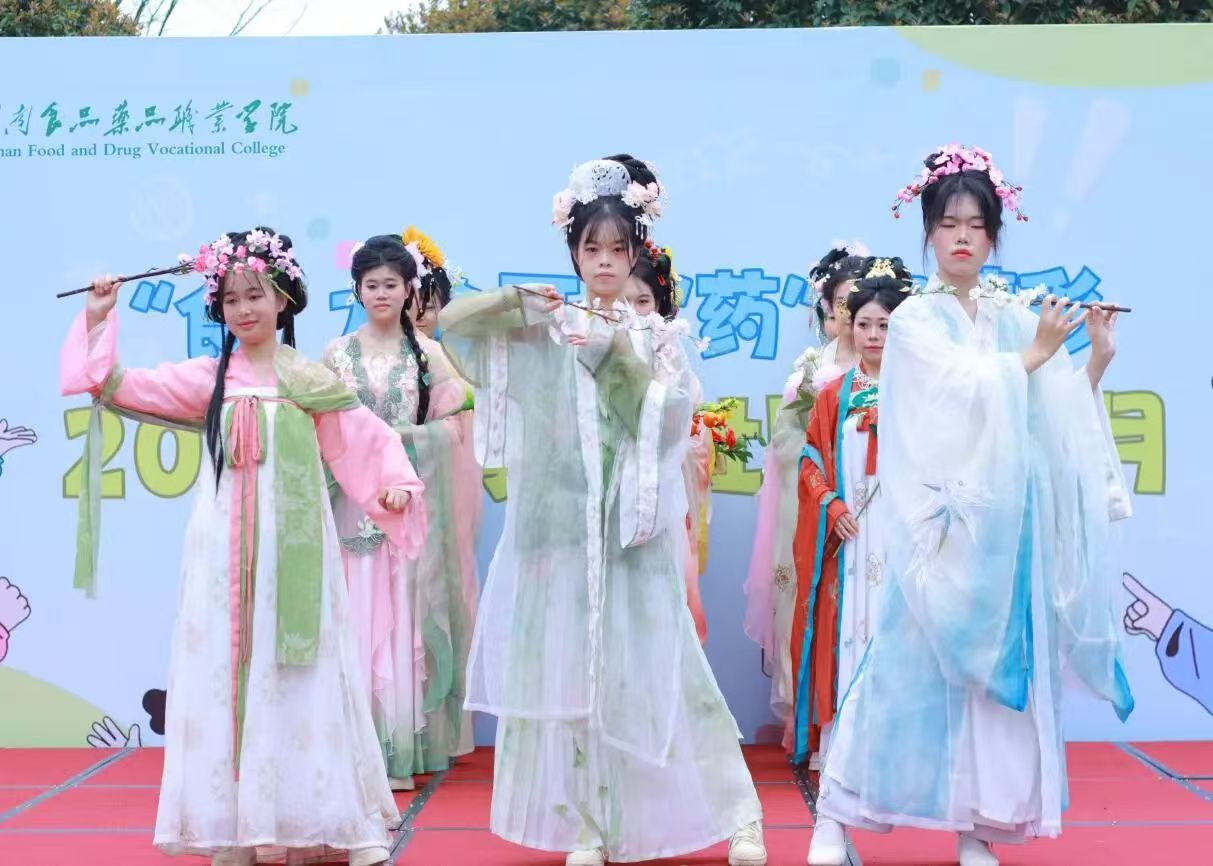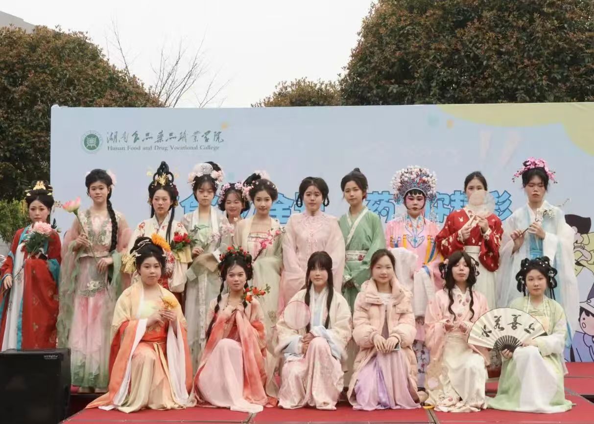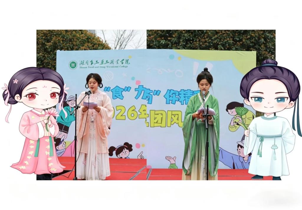 两位主持人身着淡粉与青绿色系汉服登台,衣袂翩跹间尽显国风雅致。本次主持服装的配色暗藏巧思,精准呼应了我校“湘小食”“湘小药”健康使者的专属形象,将校园文化IP与传统服饰美学巧妙融合,为这场文化盛宴增添了专属食药院的青春印记。