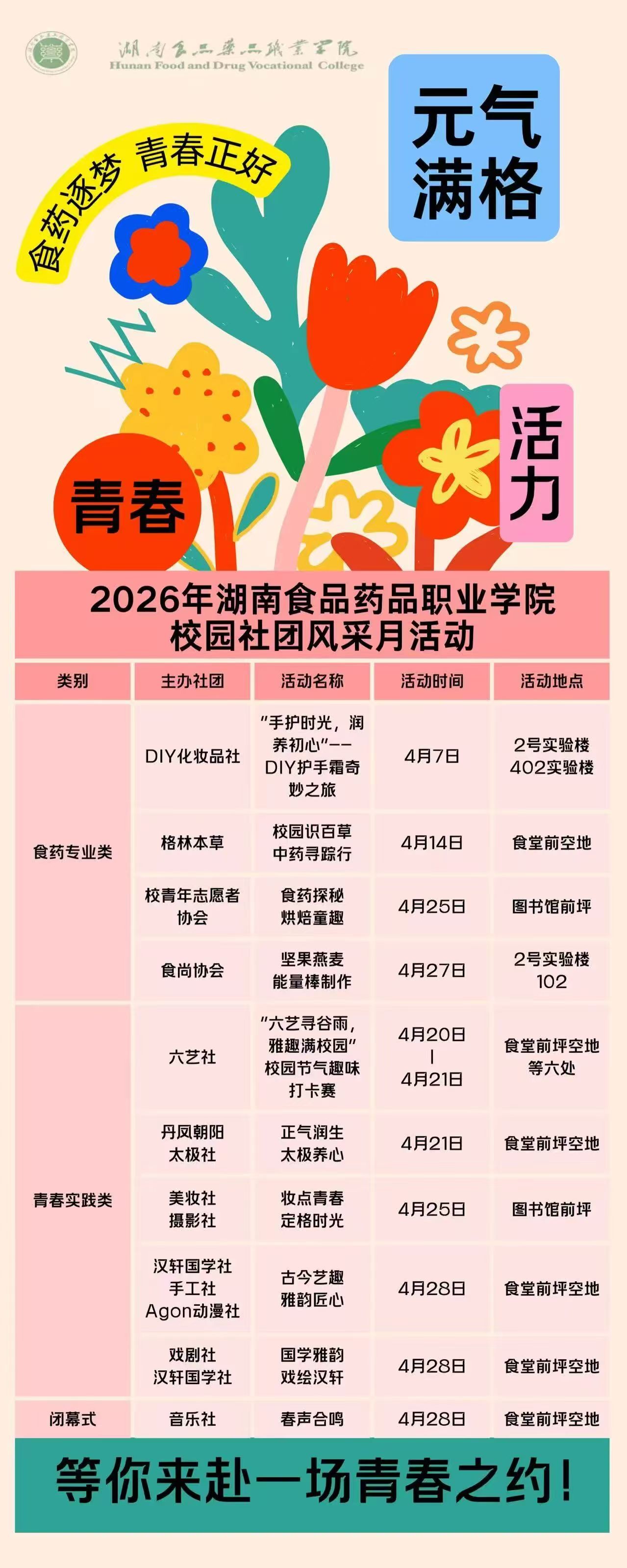 欢迎全体同学积极参与社团风采月各项活动,在春日校园里赴一场热爱之约,在体验中成长、在热爱中绽放,让青春在食药与传统的交融中闪闪发光!