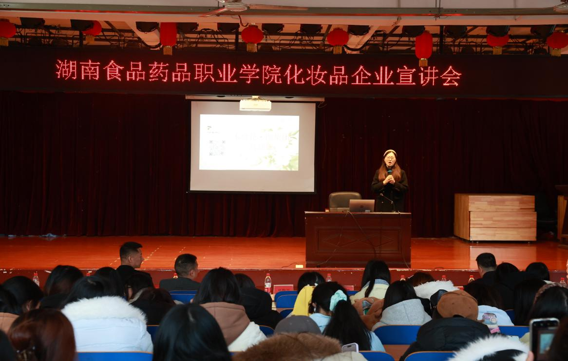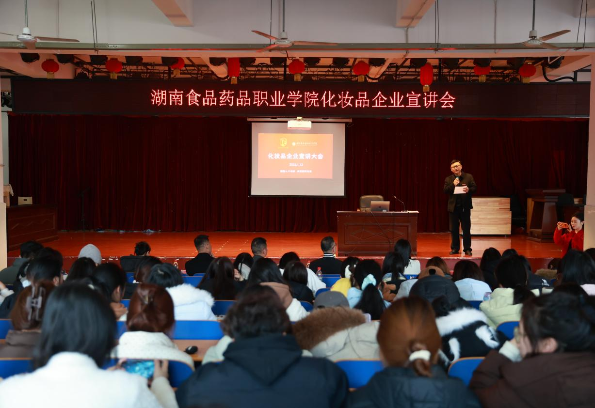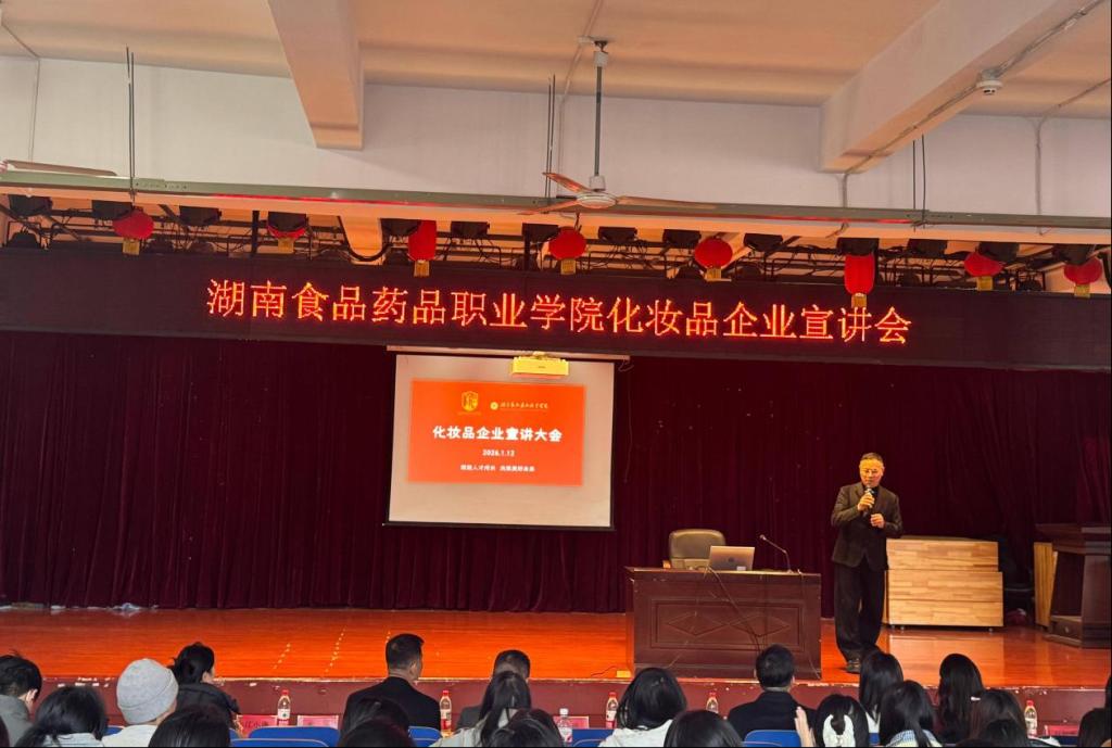 1月13日下午,湖南食品药品职业学院湖南美妆产业学院在食堂多功能报告厅成功举办化妆品企业专场宣讲会。活动以“赋能人才成长,共筑美好未来”为主题,在湖南省化妆品经营行业协会的支持下,搭建起校企高效对接平台,既助力妆管专业学子明晰职业方向、实现高质量就业,也充分彰显了学校妆管专业的育人成效。