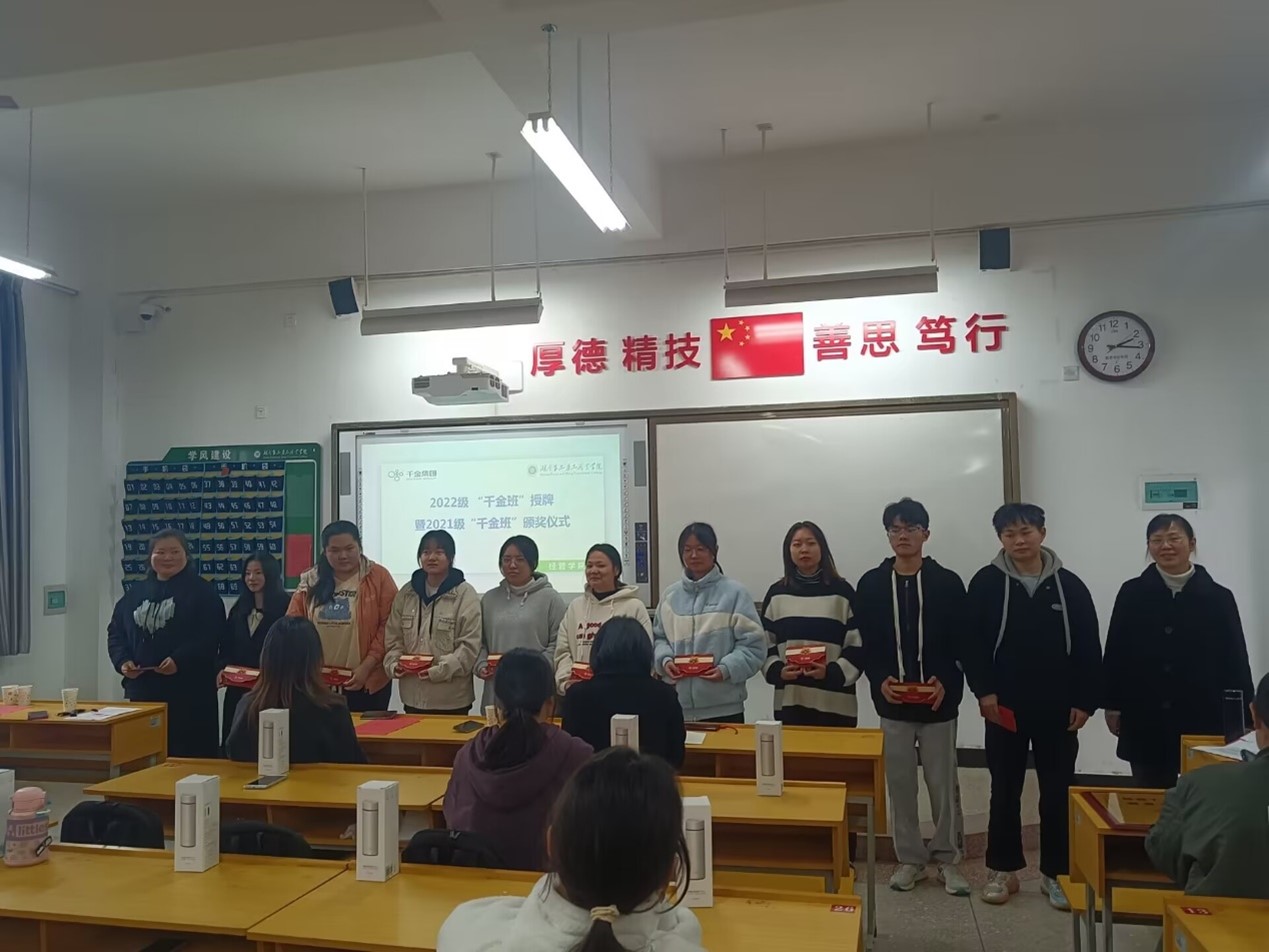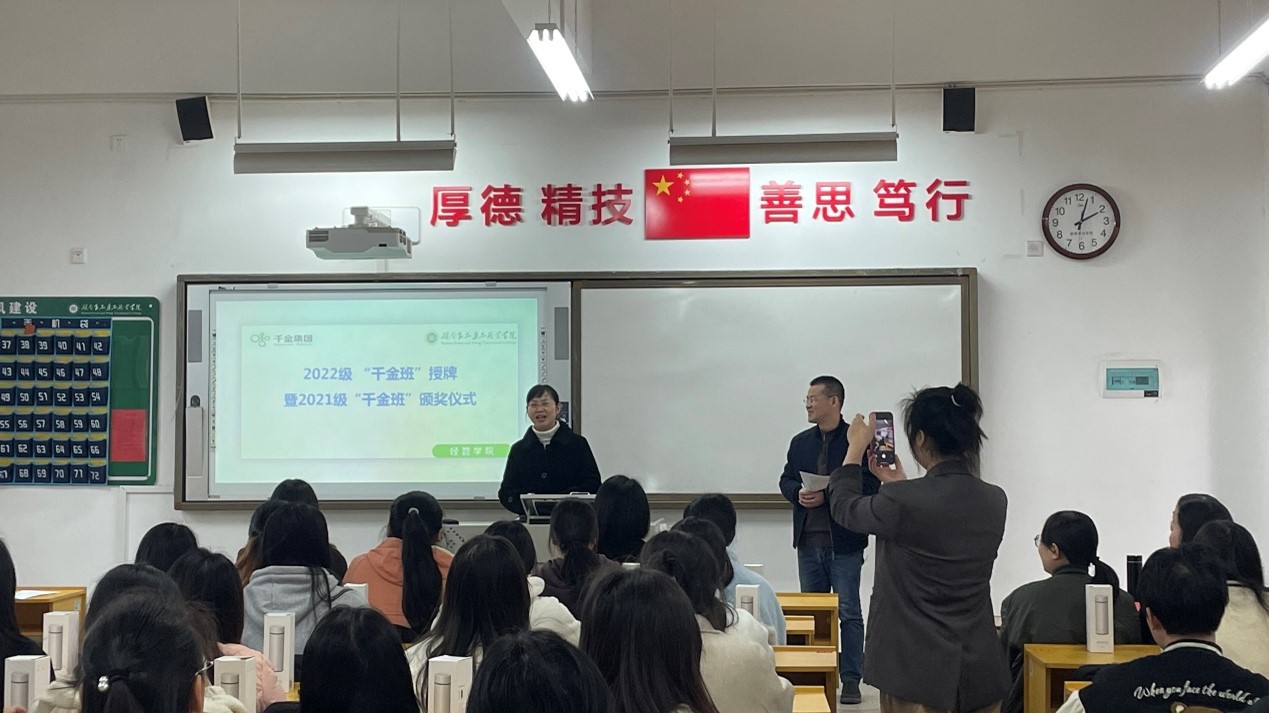 经管学院党总支书记王晓娟宣读了获奖决定。朱岩婷和甘湘宁两位领导为2022级“千金班”授牌,并为2021级“千金班”获奖同学颁奖。