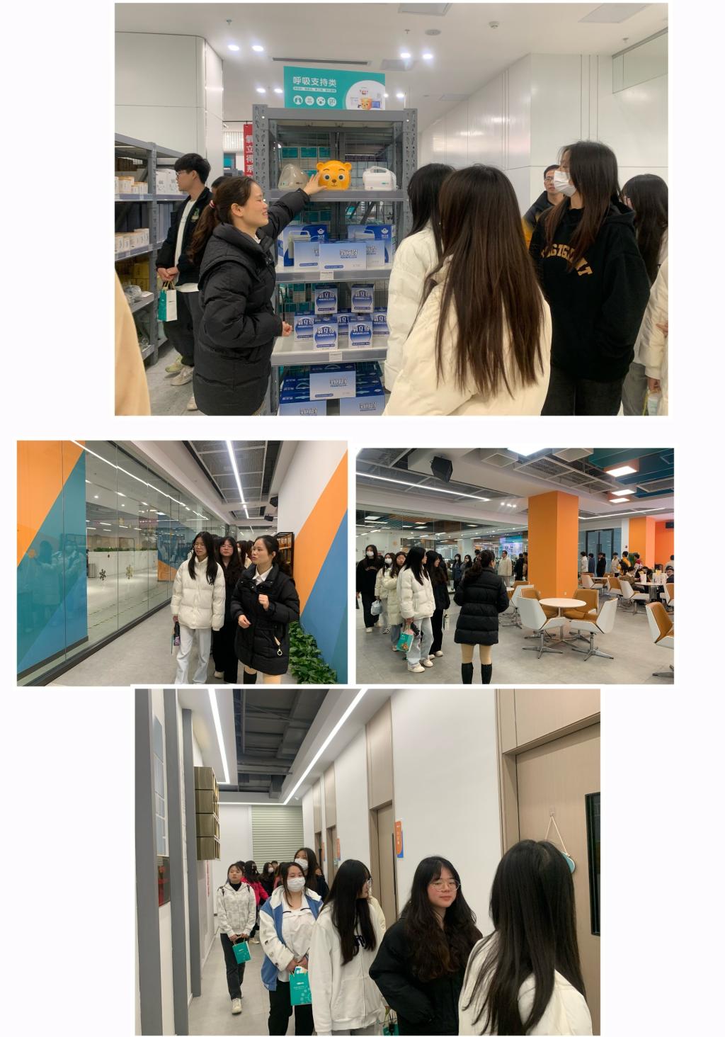 下午,在企业领导陪伴下,乘车前往企业生产园区——智庭园、新园区。同学们依次参观了可孚医疗健康监测、康复辅具、呼吸支持、医疗护理及中医理疗五大产品品类的核心产品展示区,获悉企业实现原料采购、产品仓储、实验研发、公共配套设施、物流运输、销售渠道等资源共享和智能化管理。