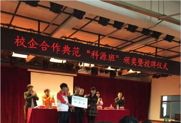 2015年12月16日,我院经管系在报告厅隆重举行校企合作“科源班”颁奖暨授牌仪式。湖南科源医疗器材销售有限公司张敏总经理、文力卿人力行政总监,学院党委书记欧阳黎明,副院长邓兴国及相关处室负责人出席颁奖暨授牌仪式。企业与学院领导对2014级“科源班”刘琼等十名同学颁发了“科源学习优秀奖”、“科源励志奖”和“科源总裁奖”多项奖学金及证书。同时,也对2015级医药营销专业班级授予校企合作“科源班”牌匾。