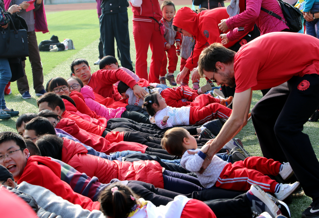 简约而精彩的运动会开幕式后是孩子们和家长的集体运动游戏时间。吉他舞——童心撞地球,孩子们和爸爸妈妈跟着节奏一起蹦起,“弹吉他”的声音嗨爆全场;烧烤游戏中,家长们躺在彩色布条上,孩子们一个个从大人们身上翻滚过去,场面温馨可爱;亲子律动——老鹰抓小鸡,孩子们可爱玩了,爸爸这个时候最能展示其英雄气概了;轮胎气球可是要锻炼孩子们的勇敢了,会场气球在轮胎中的爆裂声此起彼伏,如同放炮仗一般;蜜蜂采蜜诙谐搞笑,11个班一字排开,爸爸妈妈抱着宝宝,激烈追逐;珠联璧合不仅考验家长们的细心,更是锻炼了孩子们坚持不懈的精神;战斗律动,大家一起噼里啪啦地开起了手枪和机关枪;最后是千人亲吻比赛,孩子们擦去爸爸妈妈额头的汗水,感谢他们在这次运动会中的付出,感恩他们的陪伴,亲子间的一句“我爱你”,温馨感人。