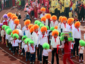 下午两点,运动会随着运动员进行曲的奏响拉开了序幕,大中小共11个班的小运动员们和爸爸妈妈手拉手,大家衣着靓丽,打扮创意,喊着整齐洪亮的口号,气势浩荡的迈入会场。