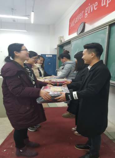 根据“两学一做”学习教育总体安排,为深入贯彻落实学院关于结对帮扶困难学生的文件精神,1月3日下午,经管系党总支对结对帮扶的王丹、桂雪花、李杰3位同学开展了献爱心、送温暖活动,将“爱心款”、老百姓大药房连锁股份有限公司捐赠的床品四件套和澳大利亚华侨魏兆祺夫妇捐赠的御寒冬衣送到了他们手中。