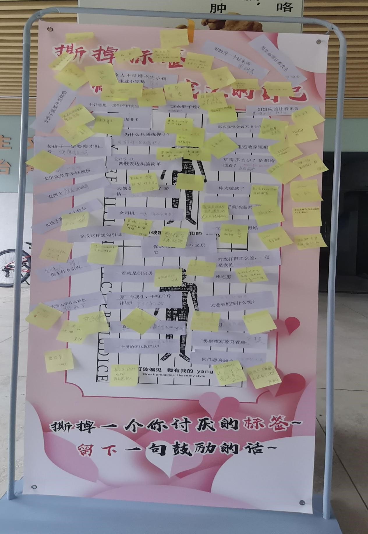 活动中,同学们纷纷驻足,积极参与。海报上“女孩子一定要瘦才好看”“女孩子那么拼干什么,早点嫁人就好”“大老爷们哭什么哭?”“你太敏感了”等社会对男生女生刻板印象和偏见标签,让同学们想到被别人偏见定义的自己。在周围同学的互相鼓励下,大家上前坚决地撕下或者划掉了那些带有自身被定义的标签,取而代之写上反驳的文字贴在展板上,相互传递着温暖的力量。一句句鼓励的话语不仅给予了自己勇气,还提醒着同学们要携手守护身边的每一个人,拒绝给他人“贴标签”。