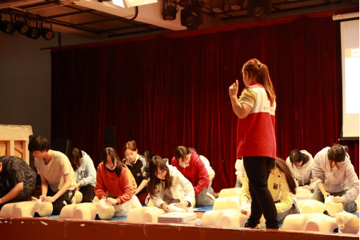 在实践操作环节,学生们积极参与,在讲师的指导下进行了胸外按压、人工呼吸以及AED设备的模拟操作,切实掌握了CPR+AED的急救技能。