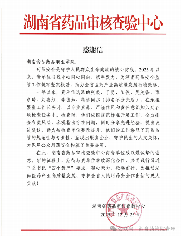 感谢信指出,药品安全是守护人民群众生命健康的核心防线。2025年以来,湖南食品药品职业学院与省药品审核查验中心紧密合作,共同为全省药品安全监管工作筑牢基础,有力推动了医药产业的高质量发展。