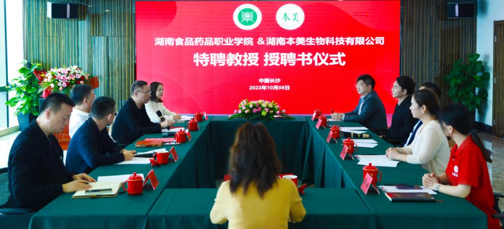 2023年10月8日上午,在湖南省化妆品经营行业协会的推动下,湖南食品药品职业学院与湖南本美生物科技有限公司特聘教授授聘书仪式在本美集团举行。