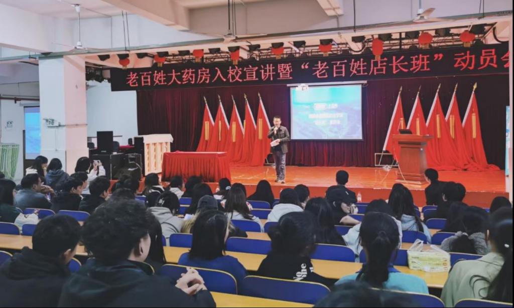 12月7日,我校经管学院积极响应教育部2024届全国普通高校毕业生就业创业工作视频会议精神,邀请老百姓大药房人力资源总监李少华一行,在学校报告厅举行“老百姓大药房入校宣讲暨‘老百姓店长班’动员会”,2022级药品经营与管理专业全体同学参加,经管学院院长刘喜红,副院长邓媚全程参与。