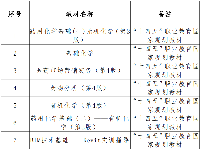 根据湖南省教育厅《关于做好职业教育一流核心课程、优质教材、校企合作典型生产实践项目以及具有国际影响力的职业教育标准、资源和装备建设等改革重点任务工作的通知》的要求,经教师个人申报、二级学院推荐、专家遴选,拟推荐《药学服务实务》等4门课程申报2023年职业教育一流核心课程,拟推荐《药用化学基础(一)无机化学(第3版)》等7本教材申报优质教材。
