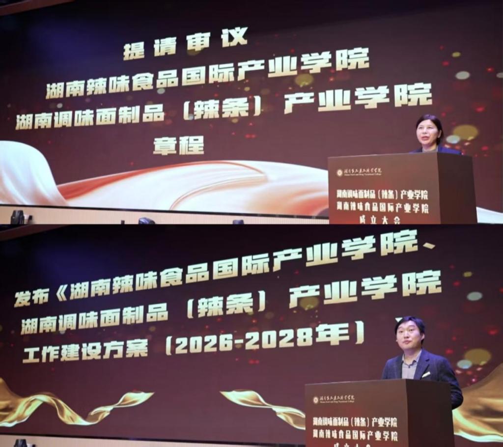 大会还完成了多项重要议程:全体代表审议并一致通过《湖南辣味食品国际产业学院、湖南调味面制品(辣条)产业学院章程》,《章程》明确了产业学院的组织架构、运行机制与发展目标;现场发布《湖南辣味食品国际产业学院、湖南调味面制品(辣条)产业学院工作建设方案(2026—2028年)》,从人才培养、技术研发、国际合作等方面绘就未来三年发展蓝图。