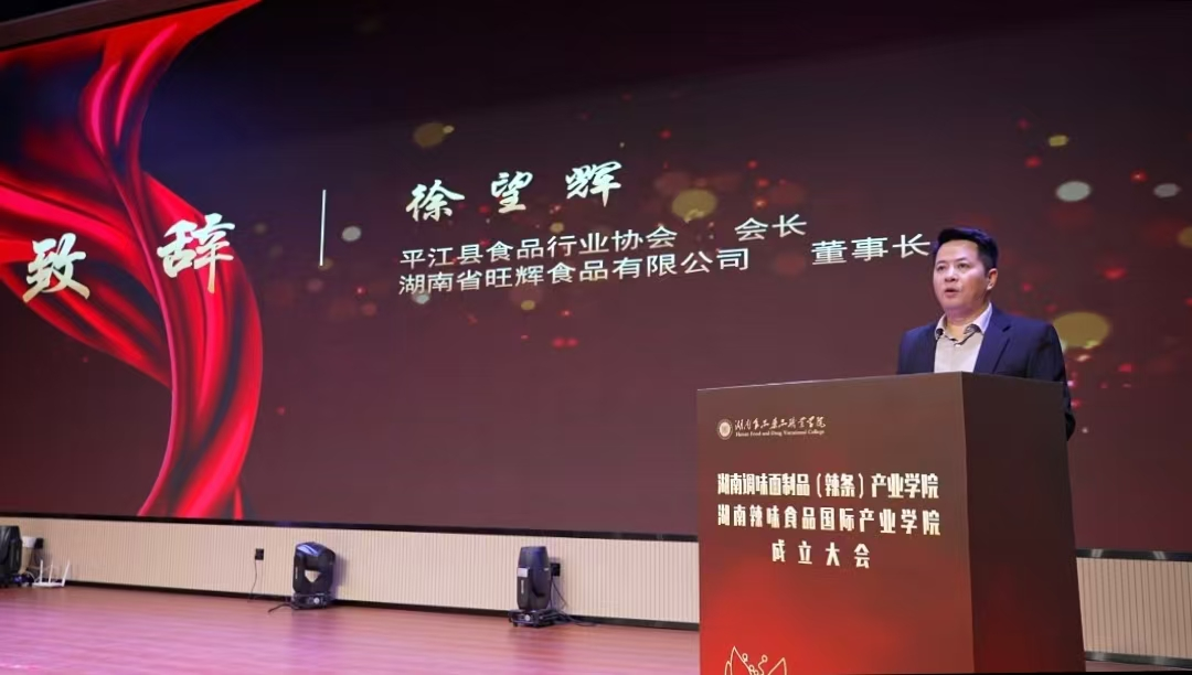 平江县食品行业协会会长、湖南省旺辉食品有限公司董事长徐望辉在致辞中指出,平江辣味食品产业从地方小作坊成长为千亿级赛道,离不开政校企的同心聚力。他承诺,龙头企业将以产业学院为纽带,开放生产车间、共享市场资源,把产品创新、品质管控与国际市场开拓的实践经验转化为教学资源,助力培养既懂技术又通市场的复合型人才,推动产业从“规模扩张”向“质量提升”跨越。