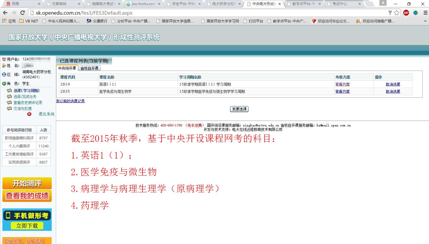 根据湖南电大的安排,《英语1(1)》(暂缓)、《医学免疫与微生物》、《病理学与病理生理学(原病理学)》、《药理学》安排在网络进行考试。