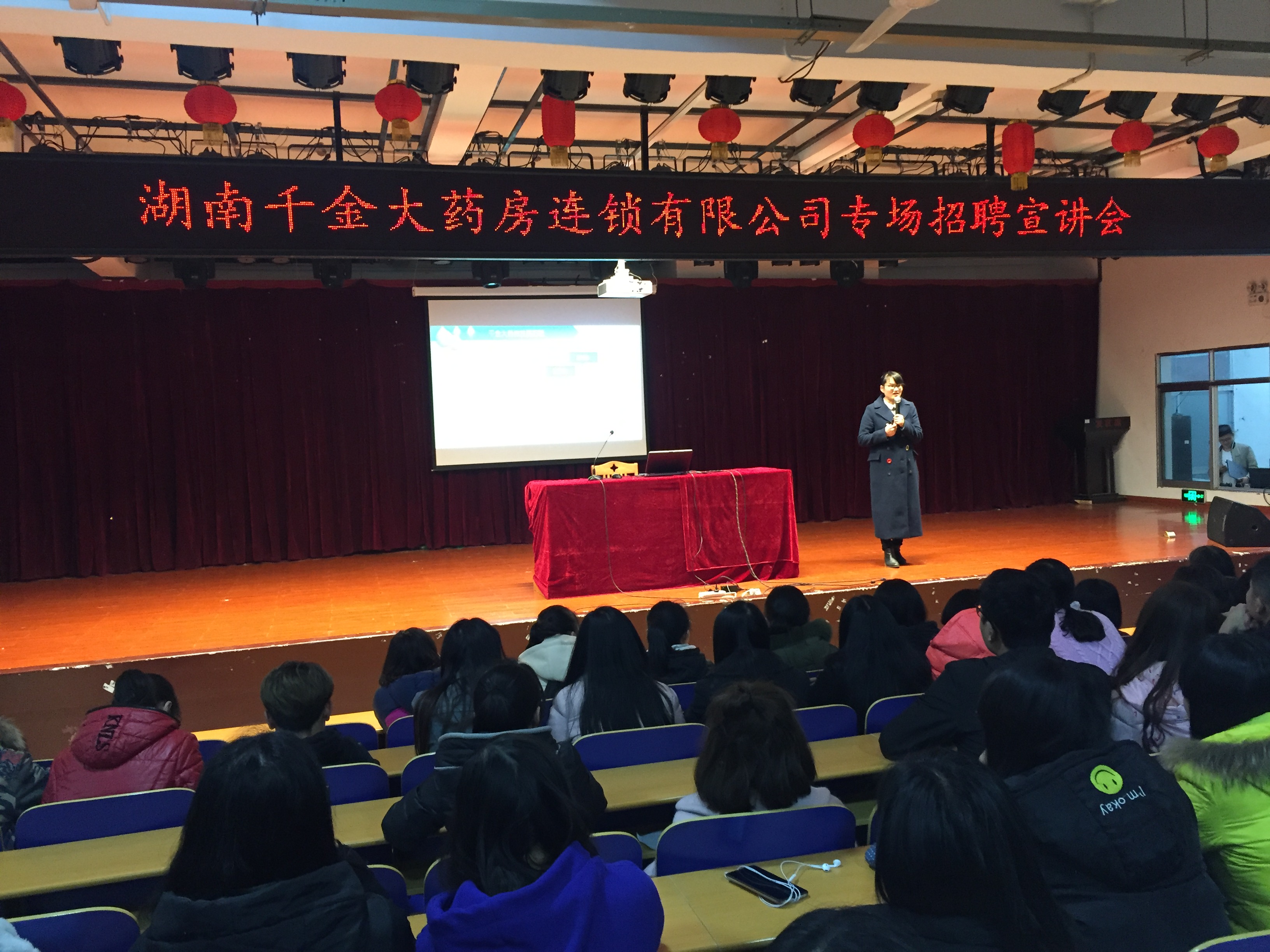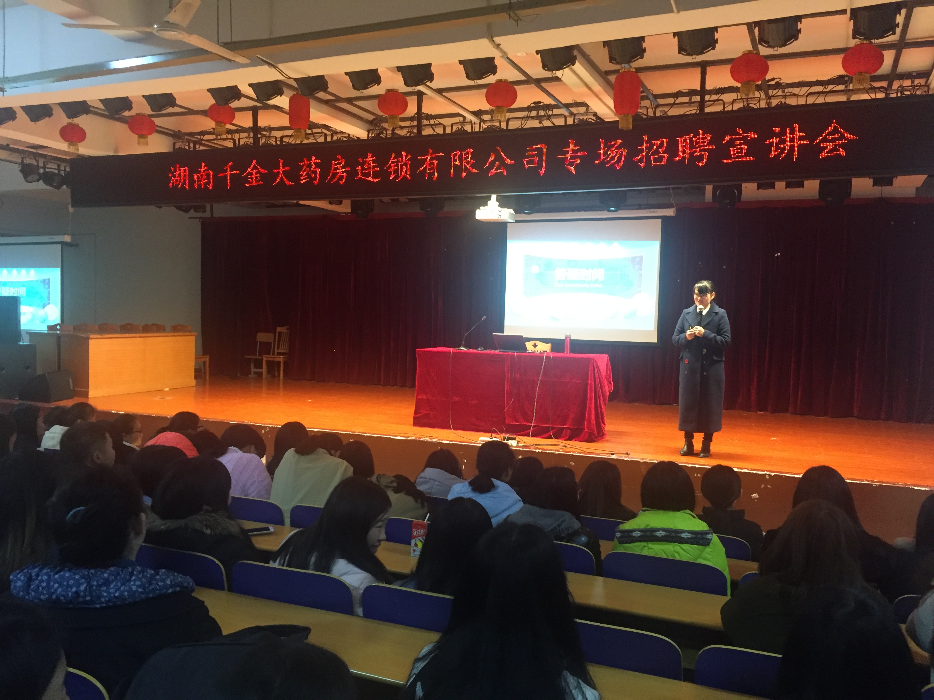 湖南千金大药房连锁有限公司来我院宣讲 返回列表 发布日期: 2017-04-05 作者: 资料来源: 3月14日晚,招生就业处组织湖南千金大药房连锁有限公司在我院多功能报告厅举行专场招聘宣讲会。 湖南千金大药房连锁有限公司是上市公司“千金药业”全资控股的国家大型药品零售连锁企业,总部位于湖南省长沙市,是湖南省最早通过国家药监GSP认证的药品零售企业之一,综合实力居省内同行前列,500多家门店分布在湖南长沙、株洲、湘潭、郴州、益阳、岳阳、怀化等城市。 湖南千金大药房连锁有限公司此次招聘主要面向药学、中药学及相关专业实习生。 上一条贵州健兴药业有限公司来我院宣讲 下一条湖南仁康泰大药房连锁有限公司来我院宣讲