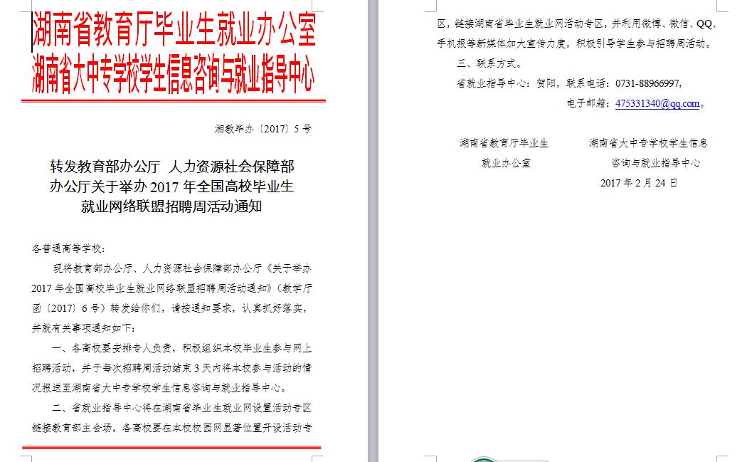 转发:湘教毕办〔2017〕5号 转发教育部办公厅 人力资源社会保障部办公厅关于举办2017年全国高校... 返回列表 发布日期: 2017-03-01 作者: 资料来源: 上一条关于全国高校毕业生就业市场湖南分市场举办系列招聘活动的通知 下一条湖南食品药品职业学院2016年毕业生就业质量年度报告